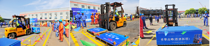 啟動(dòng)儀式后,來(lái)自新?lián)P子造船9個(gè)車間/部門舉薦的18名叉車工參加了首場(chǎng)技能競(jìng)賽。叉車工競(jìng)賽項(xiàng)目為勇闖四關(guān)。四關(guān)是指實(shí)干篤行(過(guò)S彎道)、強(qiáng)基固本(巧碼貨盤)、專業(yè)精進(jìn)(寬物進(jìn)窄門)、勇攀高峰(搭酒杯塔),項(xiàng)目是對(duì)參賽選手綜合能力的考驗(yàn),要求做到“快、巧、準(zhǔn)、穩(wěn)”,即快速通過(guò)障礙、叉運(yùn)寬物進(jìn)窄門、精準(zhǔn)堆放貨盤、平穩(wěn)搭建杯塔。