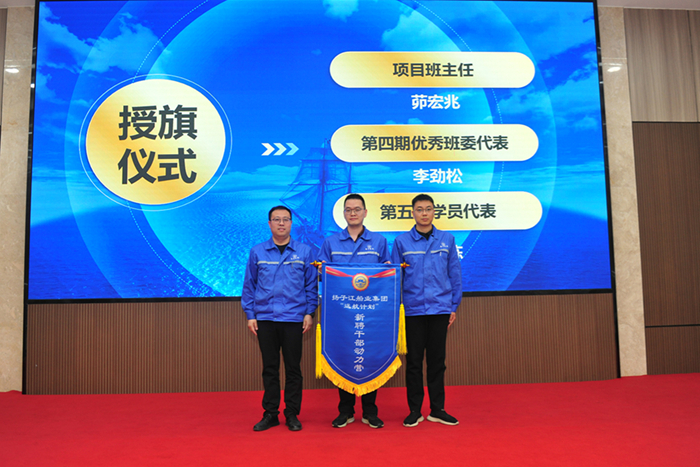 會上,茆宏兆副總將代表傳承的班旗交于第四期新聘干部優(yōu)秀班委李勁松,由李勁松將它傳承給第五期學員代表陳棟。