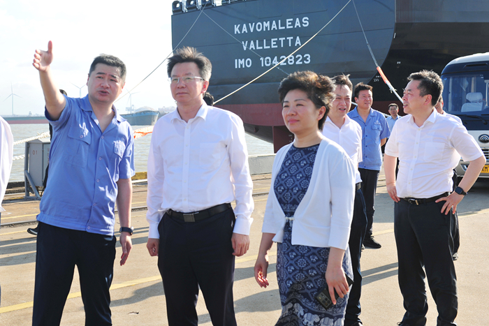 調(diào)研中,李忠軍副省長(zhǎng)一行深入公司生產(chǎn)一線,只見(jiàn)一艘艘成型的新船正在水下作舾裝調(diào)試,船塢內(nèi)各類船舶正在加緊建造,一派繁忙的船舶建造場(chǎng)景。在座談會(huì)上,李忠軍副省長(zhǎng)詳細(xì)了解我司運(yùn)行情況,詢問(wèn)地緣政治、貿(mào)易戰(zhàn)等帶來(lái)的影響、未來(lái)航運(yùn)市場(chǎng)變化分析以及企業(yè)的應(yīng)對(duì)舉措,勉勵(lì)企業(yè)按照新質(zhì)生產(chǎn)力發(fā)展要求,加快高端化、智能化、綠色化步伐,加快智改數(shù)轉(zhuǎn)網(wǎng)聯(lián),不斷提升船舶研發(fā)能力和建造水平,進(jìn)一步增強(qiáng)江蘇高技術(shù)船舶與海工裝備先進(jìn)制造業(yè)集群的國(guó)際競(jìng)爭(zhēng)力。