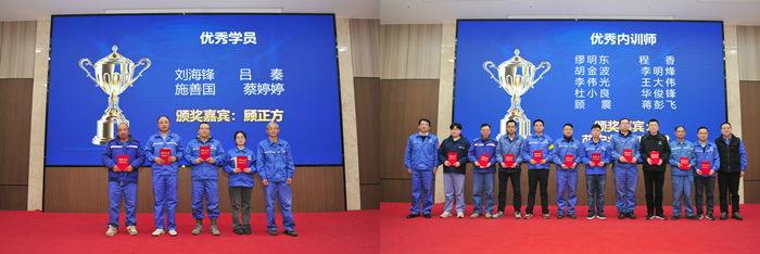 在結(jié)業(yè)儀式上,4名優(yōu)秀學(xué)員代表分別結(jié)合自身參與的《揚(yáng)子江造船解決方案》(YSS 2.0)、電子化廠圖等課題,分享了數(shù)字化轉(zhuǎn)型實(shí)踐中的經(jīng)驗(yàn)與感悟。2025年集團(tuán)內(nèi)訓(xùn)師全年授課量達(dá)732課時(shí),培訓(xùn)人次超2.5萬,其中安環(huán)條線人均授課17課時(shí),生產(chǎn)條線人均14課時(shí),展現(xiàn)了內(nèi)訓(xùn)師團(tuán)隊(duì)的強(qiáng)大賦能能力?,F(xiàn)場(chǎng)表彰了4名“智改數(shù)轉(zhuǎn)專項(xiàng)優(yōu)秀學(xué)員”和10名“優(yōu)秀內(nèi)訓(xùn)師”,公司領(lǐng)導(dǎo)為獲獎(jiǎng)?wù)哳C發(fā)證書及獎(jiǎng)金。
