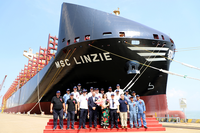 9月4日,我集團與地中海航運共同為新船舉行了命名祈福儀式。命名人Martyna Orzechowska女士,地中海航運新造船部門駐揚子鑫?,F(xiàn)場辦經(jīng)理羊海濤先生,我集團總經(jīng)理助理兼揚子鑫福造船總經(jīng)理楊雪彥先生,挪威船級社江陰站靖江部門經(jīng)理莊華平先生,以及船東監(jiān)造組、船檢、船廠、船員相關人員代表及嘉賓出席了儀式。命名人Martyna Orzechowska女士將新船命名為“MSC LINZIE”輪,為新船砍纜、擲香檳禮、拉響汽笛,并與船長共同在新船畫框上署名留念,祝福隨船船員航行平安,為船東和租家?guī)順s譽和財富。