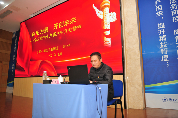 為深入學(xué)習(xí)宣傳貫徹黨的十九屆六中全會(huì)精神,12月29日下午,公司特邀江陰市委宣講團(tuán)成員、園區(qū)黨委委員、紀(jì)委書(shū)記劉銘來(lái)司進(jìn)行黨的十九屆六中全會(huì)精神宣講。