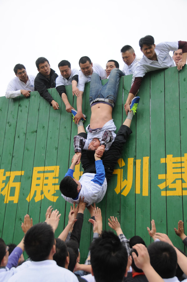 下午的拓展項(xiàng)目更是“體驗(yàn)升級”,“卓越圈”項(xiàng)目讓人意識到從優(yōu)秀到卓越不是一蹴而就的,是一個(gè)曲折的過程,是一個(gè)不斷超越的過程,在一輪一輪挑戰(zhàn)5.4秒這個(gè)終極時(shí)限的過程中,我們的年輕干部們磨傷了手、劃傷了臉、蹲酸了腿,任灰塵在身邊沸騰,任汗水在臉上流淌,他們都沒有退縮一步,不斷的嘗試、改進(jìn)、再嘗試、再改進(jìn),最終,5.21秒這個(gè)卓越的成績被記錄在了成績冊上,大家歡呼雀躍。到了最后的挑戰(zhàn)了,“畢業(yè)墻”垂直立于地面,沒有輔助設(shè)施,沒有輔助人員,大伙兒覺得需要1.5小時(shí)這47名學(xué)員才能全部翻過這面墻——4.2米高的墻。按照教練的指導(dǎo),做基礎(chǔ)的、做輔助的、做保護(hù)的、做拉手的,自發(fā)輪流上陣,伙伴們一個(gè)一個(gè)互相拉扯著翻越了畢業(yè)墻,他們中有人肩膀被踩破了,有的肌肉僵硬了,有的手臂勒紫了,但都沒有吭一聲,只想著讓所有的伙伴全都快速翻過墻,堅(jiān)持不懈的精神在他們中不斷傳遞著……終于他們創(chuàng)造了一個(gè)自己都沒敢想的奇跡,15分49秒51,所有47人全部完成了翻越!